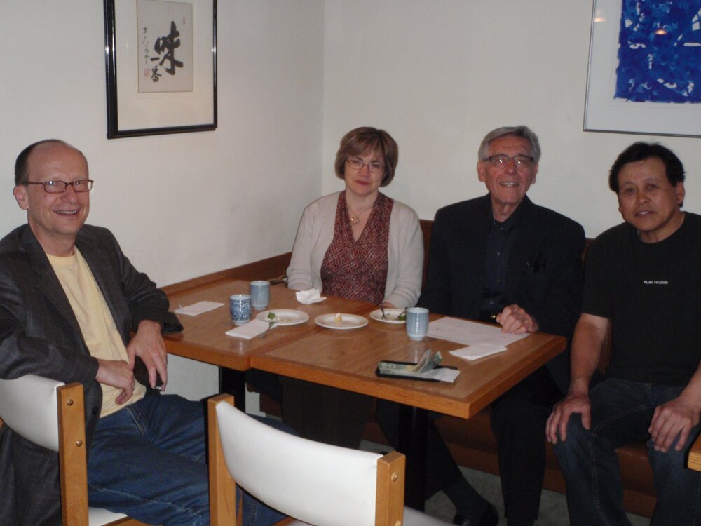 この「三たて」蕎麦ですが、まずソバはカナダのソバの故郷マニトバ産の玄ソバを、新ソバの出来た10月頃に仕入れ、それを色々工夫して冬眠状態に置き保管します。玄ソバは、生きているので管理が悪いと直ぐに劣化し、最悪は死んでしまいます。保管には、摂氏7度から10度、湿度75%程度にセットした恒湿定温冷蔵庫に、麻袋入りの一俵バッグ乃至紙袋入りの半俵バッグで寝かせ保存する方法が、日本の製粉業者が主に採用している一般的方法ですが、この場合玄ソバでも半年位、丸抜きと言って皮を剥いたソバだと約一月程度が限度であり、その後は風味が飛んでしまうとの事です。新ソバは10月ですから、これだと翌年の4月か精々5月位までしか新ソバの美味しさを保てませんから、一番そばの需要がある夏場は品質には、やや眼をつぶったヒネ蕎麦しか食べられない理屈になり、きちんと管理している場合でもこうなのですから、まして杜撰な管理下にあったソバは言うに及ばすです。ですからあの有名な漫画「美味しんぼ」の「真夏のそば」になる訳です。特に日本は高温多湿で梅雨もありますからカナダに比べると比較にならぬ程劣化が進みます。理想的には、玄蕎麦を乾燥させ略完全に水分を抜いてから真空パックにしておくともうこれは100年でも鮮度を保つ事が出来るそうで、現に何処かの遺跡から発見された乾燥玄蕎麦に水を与えたら元どおりに発芽したとの記録もありますが、乾燥させたり、元の状態に戻したりするのに手間隙掛かるし、100年も保たせる必要も有りませんから、営業的には、ややコストは多めに掛かりますが、玄蕎麦を窒素のような不活性ガスを封入し真空パックして冷凍すると、新蕎麦の美味さは一年以上は充分保ちます。その際脱酸素剤でも同時に封入しておけば云う事ないでしょう。要は、水と酸素と光から玄蕎麦を隔離して劣化を防ぎ、低温を維持して穀物を冬眠状態に置けば良いのです。 その玄ソバを毎朝、その日の使用分だけ自家製粉します。物凄く厳密に言うと、ソバは挽いてから24時間たつと、ソバの香りが無くなってしまうとマニトバ大学の食物栄養学の教授ロマン・ジイズビルスキー博士は言っています。彼はポーランド生まれで、40/50年ほど昔にカナダに移民して来た人ですが子供の時はカーシャ(蕎麦粥)を食べて育ったもんだと言っていました。下の写真の真ん中の人。